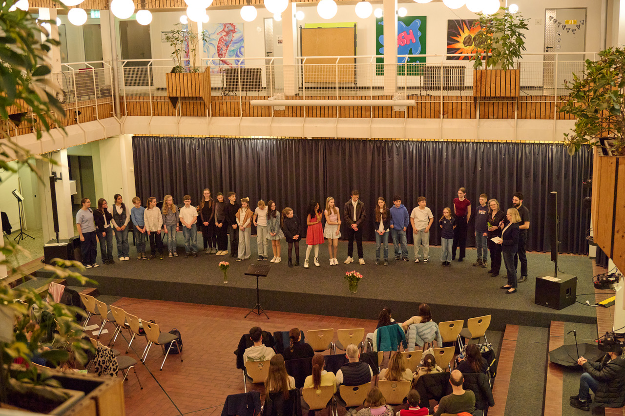Rund 25 Schülerinnen und Schüler von Klasse 5 bis zur Kursstufe gaben im Atrium ihr musikalisches Können zum Besten. Und nicht nur das - auch die Planung und Organisation lag in der Hand der Schülerinnen und Schüler.