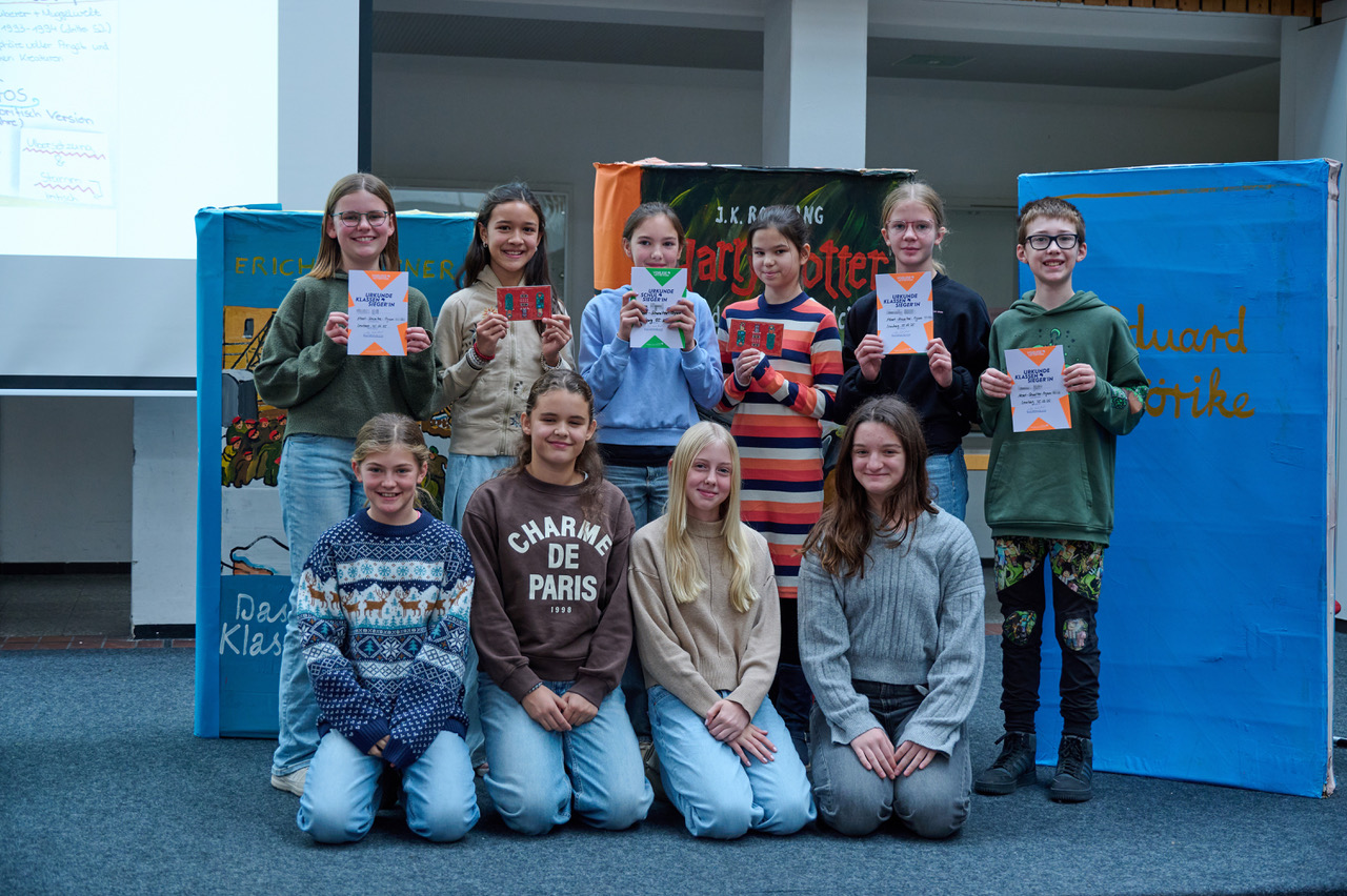 Vor passender Kulisse sieht man die Klassensiegerinnen und Klassensieger (stehend) mit unserer Schulsiegerin Lara (dritte von links) und sitzend die Schülerinnen, die als weiteren Programmpunkt die Bücher „Chaos-Königinnen“ und „Harry Potter" (Teil 3) vorstellten.