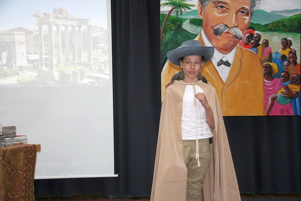 Die verbindenden Texte stammten aus der Feder einer neunten Klasse unter Anleitung der Deutschlehrerin Gudrun Sach, die auch für die originellen Kostüme und das außergewöhnliche Bühnenbild verantwortlich war. Der Unterstufenchor und alle vier fünften Klassen des ASG führten das Gemeinschaftsprojekt im Atrium der Schule auf.