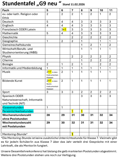 Im Schuljahr 2025/2026 werden die Klassen 7 bis 10 nach der Stundentafel "