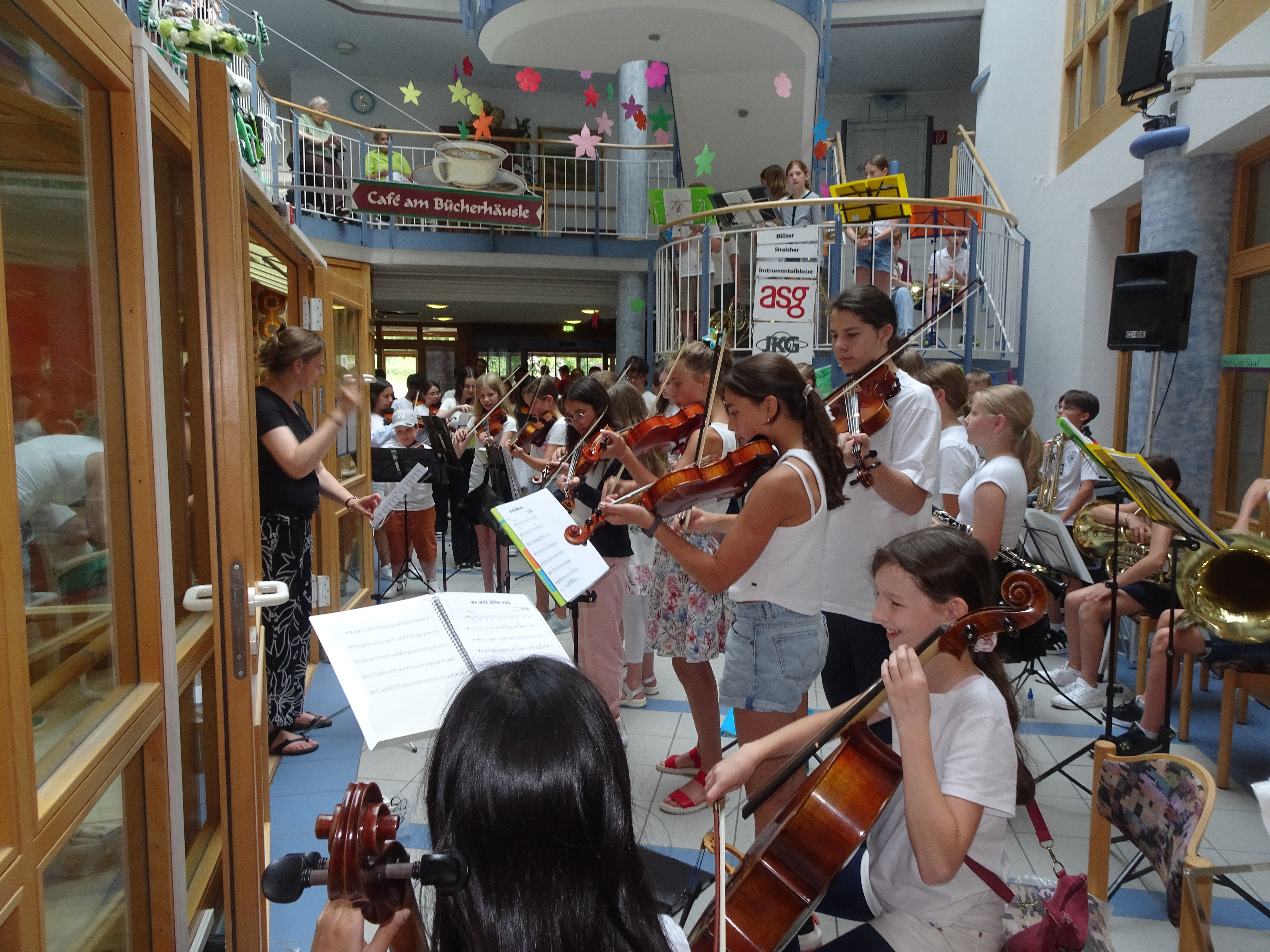 Schülerinnen und Schüler, die sich für die Instrumentalklassen entscheiden, musizieren von Anfang an in der fünften und sechsten Klasse als gemeinsames Orchester.